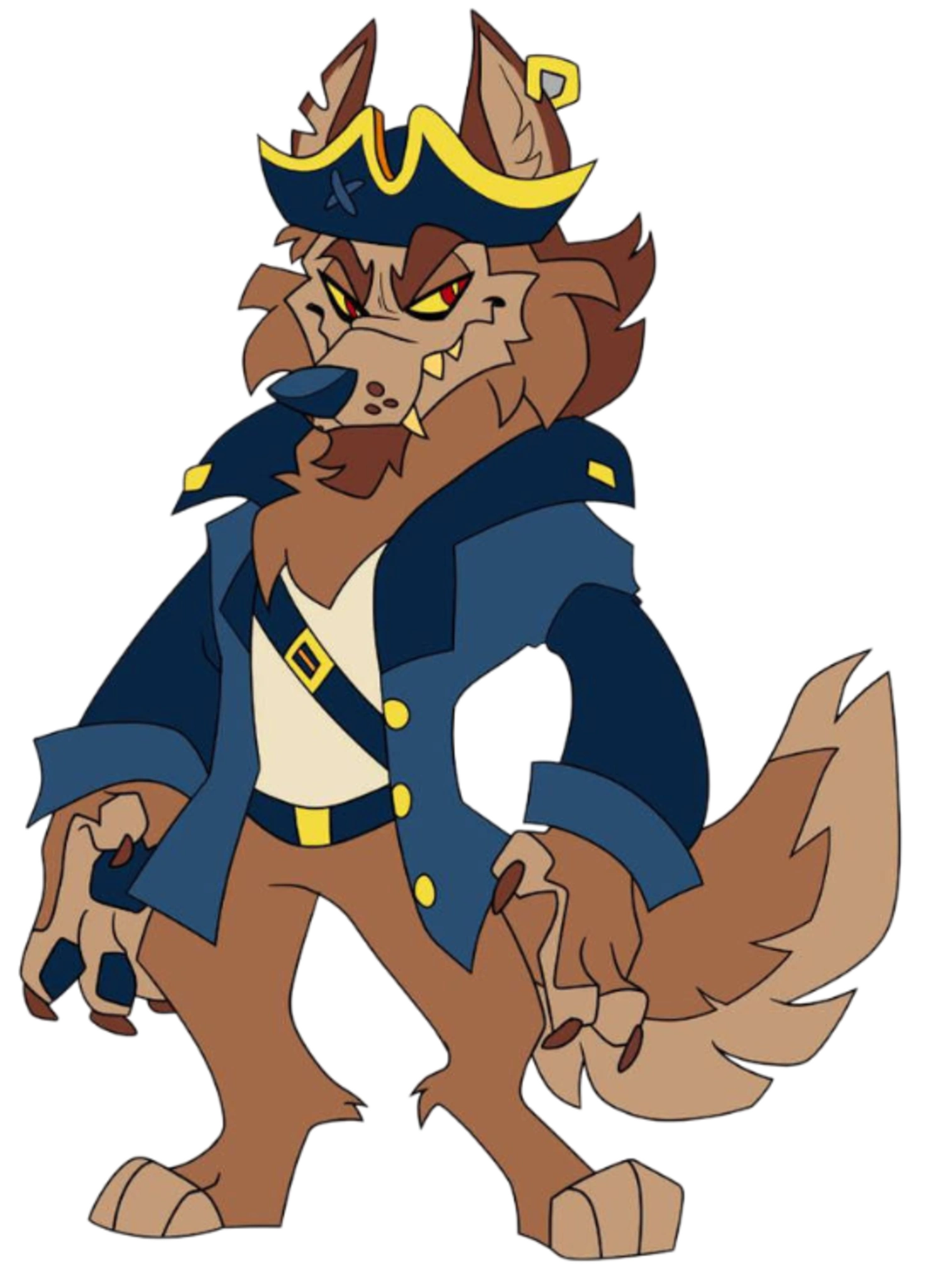 Skurv is an anthropomorphic brown coyote with glowing crimson eyes, yellow fangs, and scruffy facial fur. He wears a dark blue pirate coat with yellow buttons, an off-white undershirt and cross-sash, a belt around his waist, and a tricorn hat the same colour as his coat with a yellow trim.